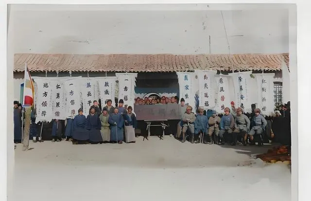 这个场景叫献匾留影,院子里旗子擎得直,匾额抬在众人中间,字迹被风沙磨过,有的已经淡了,站在两侧的人衣襟宽大,神情却拘着,外公看见会摇头,唉,那会儿有人把背弯给了错误的人,现在回头看,照片在,脸也在,谁挺了腰谁没挺,一目了然。