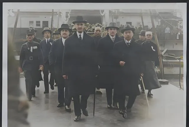 这个队伍叫调查团到访,呢大衣一水的深色,帽檐压得不低,步子迈得齐,顾维钧在侧,身形笔挺,船舷后一群人探出身子看,像看一幕将要起锚的戏,奶奶当年听过广播里念新闻,说这帮洋人来查东三省的事,念到“侵略”两个字时顿了顿,语气比平常硬,照片把那个“硬”写在鞋跟上,每一步都在板上敲出声。