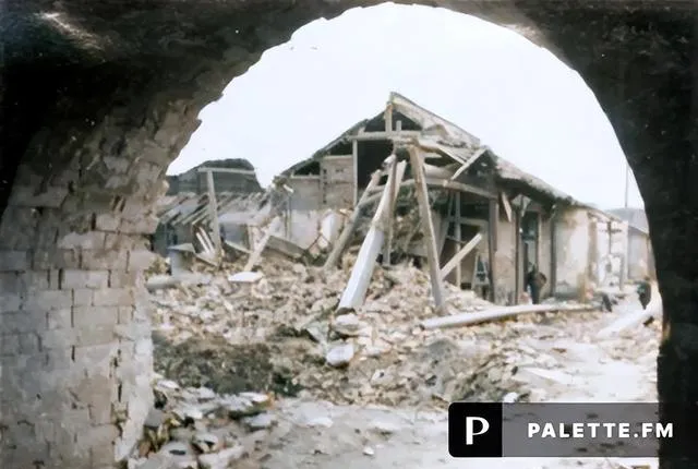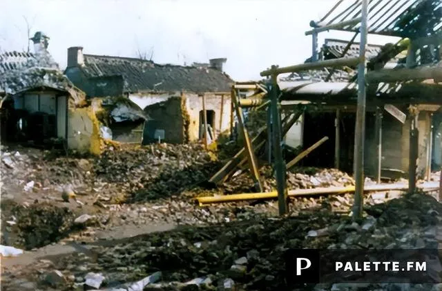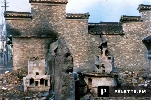 这一片叫残垣,屋脊没了瓦,窗洞黑着,远处山头搭着临时棚,白布被风拽得发紧,像一层层揭不开的霜,我妈说,小的时候路过这种地方不敢说话,怕惊动什么,现在城市夜里灯火通透,曾经这块儿连星星都不太敢露面,照片把颜色加回来,才发现灰不是一种灰,有焦灰,有土灰,还有雨打过后的湿灰。