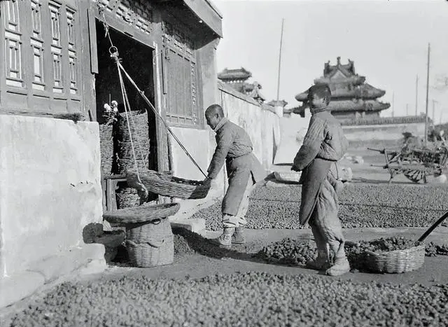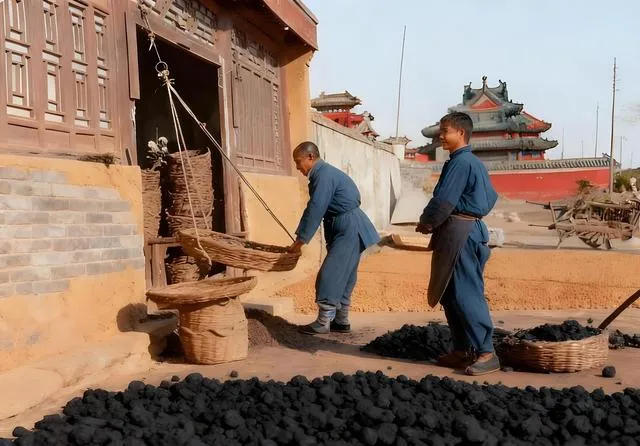 图中两位师傅手里的大竹篮配着杆秤,就是老城里常见的煤球作坊,煤泥先在木模里压实,再倒出来晒成一地黑黢黢的小疙瘩,师傅把篮子往秤钩上一挑,另一头砣子“咔哒”一滑,分量就准了,爷爷说那会儿没有蜂窝煤,烧的就是这样的小煤球,火头稳,炖锅子咕嘟咕嘟一下午不翻脸,现在谁还称煤呢,燃气一拧就着了。