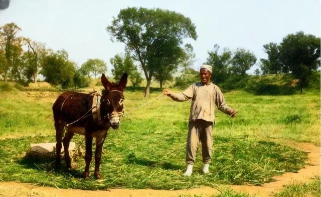 这个场景叫碾场,驴嘴上勒着轻轻的缰,木碌子在地面画圈,脚下是一圈圈压扁的秸秆,老伯笑得见牙不见眼,像刚打完收成的样子,姥爷说碾完抖一抖,谷粒下去就像下雨,蹲在边上抓一把,手掌都是暖的,现在收割机过一趟,场子没了,人也不用弯腰了。