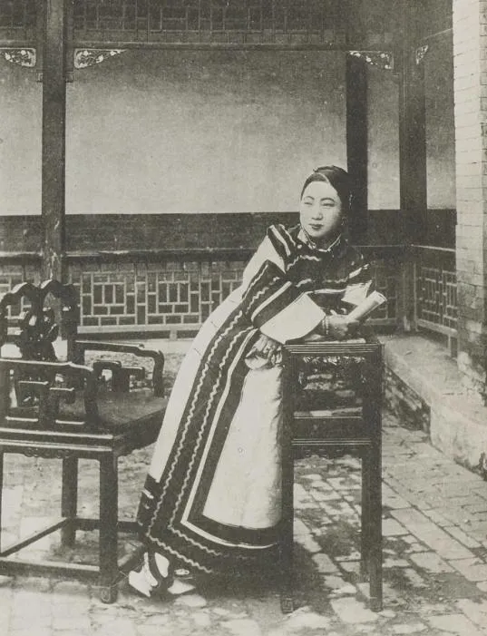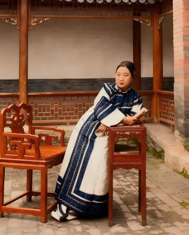 这个姿势叫斜倚,手肘压着方几,另一只手夹着书,身上那件旗装边上滚着一圈一圈的波浪纹,深蓝和米白对得利落,眼神没躲镜头,反倒有点挑衅味儿,外头都讲行正坐直,她就这么半躺着,让人记住的不是什么规矩,是那份松弛。