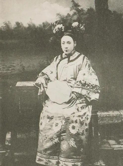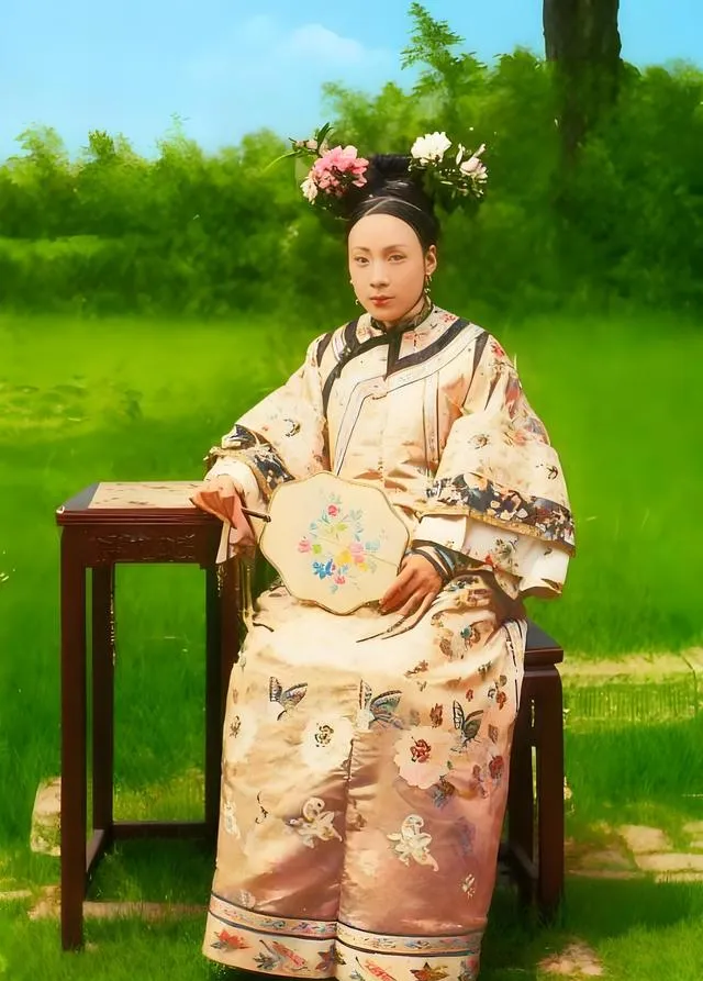 这个团扇边口是牙白色的,扇面绣花细密,衣摆上的蝴蝶纹一只一只飞着似的,指尖套着细长护甲,抬手就亮,奶奶年轻时爱说贵气是穿不出来的,要静下去才有气场,这张就是,嘴不笑,镜头也不生硬,安安稳稳坐着就是一幅画。