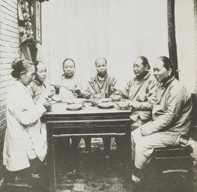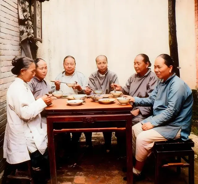 这桌子不大,四菜一汤摆得正中规矩,六位女子围坐,碗沿儿薄,手里的筷子都拿得很靠前,只有右手边那位嘴角有点笑,其他人看镜头不自在,外婆在旁边嘀咕说那时候女眷出来坐着都要稳稳的,笑也要往肚子里压,现在我们拍合影巴不得露八颗牙,规矩变了,照片也就松了。