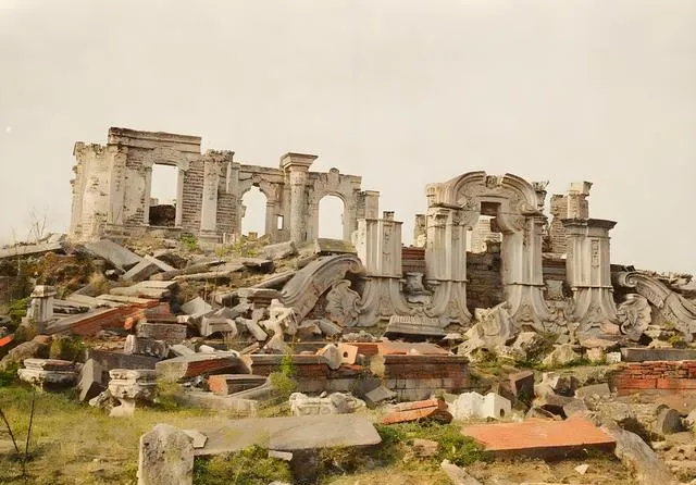 这个地方叫大水法,石柱像翻卷的浪,底下散落砖瓦一地,风一吹灰味都能想象出来,奶奶说解放前附近村里人去里头扒砖,背回来砌墙,谁也没把它当景点看,现在我们站在护栏外喊保护文物,那时候为了过活管不了那么多,这就是时势的不同。
