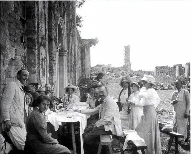 这桌椅不是中式的,长条桌、窄凳子并着摆,穿白西装的、戴草帽的围坐在废墟边上聊天吃饭,杯瓶叮当,背景是空掉的拱墙,画面怪得很,像把两种世界硬拼在一块儿,妈妈看见说这阵势像拍电影,我说也像外景地,事实上就是那几年真实的北京边角,一个字热闹,一个字荒凉。
