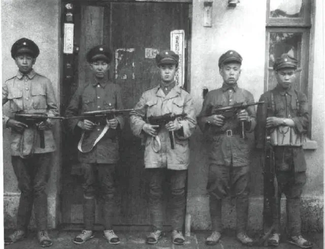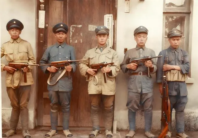 这个队形五个人并排,枪口一溜明亮,衣服颜色不完全一样,有灰有土黄,个子普遍不高,中间那位站得最直,左边那位裤腿鼓了一点,像是把绑腿缠成了螺旋,表情说不上英气,倒是有股认真劲儿,镜头的年代感很强,墙缝里贴着的小条子都能看清。