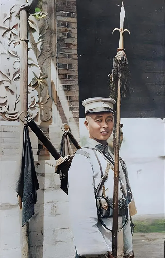 图中这根高个儿的冷兵器叫钩镰枪,长枪身上绑着弯刃,刃口外翻像个钩子,白亮的枪头扎在最前,靠近握把处还缠着缨穗,走起路来会轻轻晃,士兵背上再横着两把大刀,黑鞘贴在灰白军装上,整个人像一面移动的兵工厂他在门洞旁站岗,肩膀后仰,笑得挺开朗,爷爷看见这张就感叹一句,以前步兵怕骑兵冲锋,可这玩意儿一钩一拽就能把马带翻,近身再抽刀补上一记,不花哨,却实在。