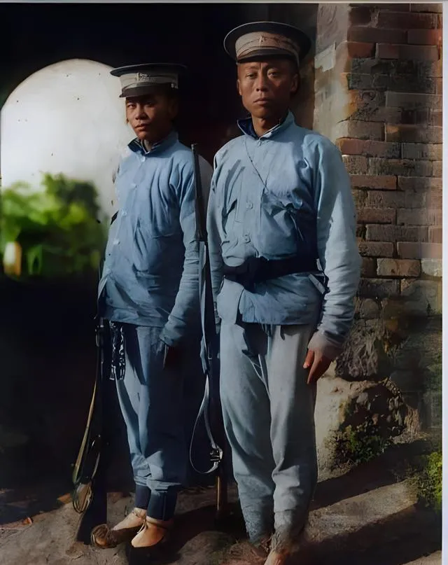 这个画面里的两位士兵穿着浅蓝单衣,腰间一条布带扎得紧,脚上布鞋脚背鼓鼓的,手里端着步枪,枪带顺着袖口垂下来,站在砖砌的门洞旁,不笑也不凶,像是刚换了哨,眼神还亮着那时候城门一站就是半天,太阳从门里挪到门外,他们就把枪根往地上一磕,换边歇一会儿,现在想想,电子通讯一声令下就能轮换,以前全靠耐心和腿劲。