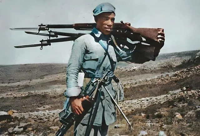 这位战士右肩挑着几支三八大盖,刺刀还挂在枪口,左手拎着轻机枪,嘴角咧开,一路走一路晃,枪托在衣布上“咯吱”一磨,听着就带劲小时候我在院子里学他,拿竹竿一肩扛,妈妈说,别学样子,要学他背后的本事,能把对手的东西变成自己的东西,才叫真本事。