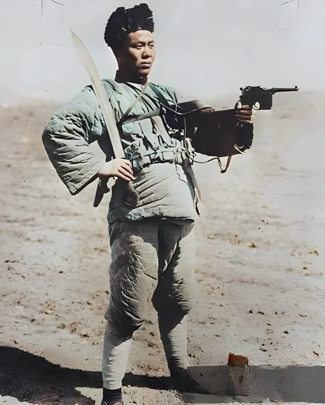 这个姿势一看就精神,他右手举着驳壳枪,左臂挂着马刀,厚棉裤裆鼓成一朵云,腰上绳带打结,风一吹就拍着衣襟响,眼神却不飘外公讲过西北军的手枪队,近身快进,远了点就点火,贴身就抡刀,讲究的是起落果断,没空说教,没空犹豫。