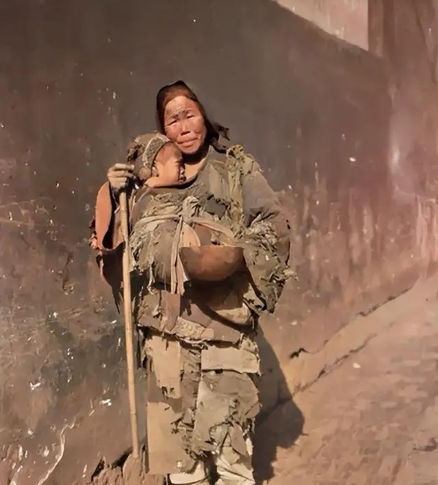 这位怀里抱着娃的叫讨口子,身上的衣裳补丁叠补丁,手里拄一根竹杖,碗里只要有个响声就是希望,小时候我问爷爷,人家咋这么穷,爷爷叹口气说,荒年多、差役重、病一来就塌了,这张照片不用讲理儿,光是那双眼睛,就够让人安静一阵子。