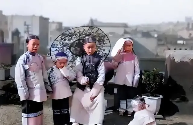 这群穿绣边衣的小朋友里,女孩脚下裹的是小脚鞋,圆伞后头露出半张脸,眉心贴花,站姿拘谨,奶奶说当年走两步都喘,鞋跟像豆子一样尖,漂亮是漂亮,遭罪是真遭罪,现在孩子脚蹬运动鞋就往操场跑,那会儿的孩子,玩耍都带着规矩。