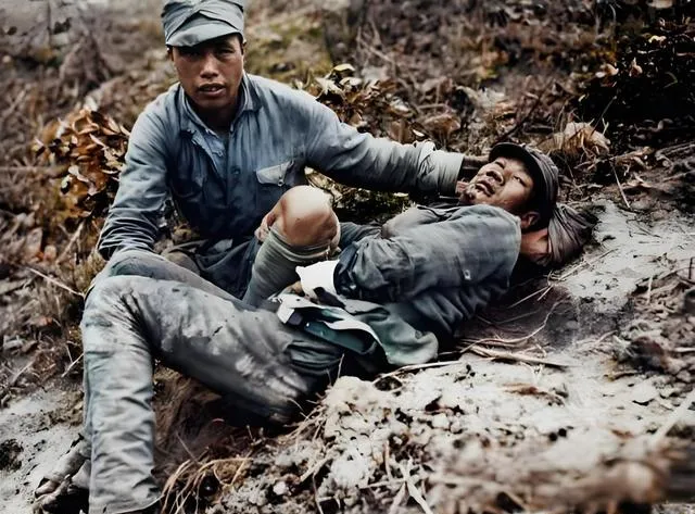 这个画面里躺着的是川军弟兄,泥地里混着枯叶,褂子膝盖处磨起毛,伤口止不住往外渗,他的战友半跪着托住肩胛,嘴唇抿得发白,没空喊疼,先把人拖到背风处再说,帐也不用搭,披一件破棉被就是救护所。
