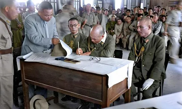 这个场面就叫芷江受降,桌面铺着三色边,纸张摊平,钢笔在灯下发亮,有人低头签字,有人侧身翻页,墙上横幅写着“公为天下”,空气像被钉住了一样稳,镜头外的嘈杂被屏蔽,只留下“刷”地一笔,历史就此落款。