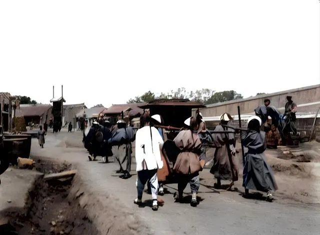 图中这辆黑漆方顶的叫八抬大轿,厚厚的漆面油亮,四角垂着流苏,前后两根粗壮的杠子一字排开,八名轿夫分两列扛着走,脚步一齐一落,肩膀下垫着麻布,免得被杠子硌得生疼,小时候我在庙会上见过彩轿,虚头巴脑好看,却没这架子的份量,这真是权势的流动牌面,奶奶说,遇见轿子过街,人要靠边站,帽檐压下去,别多看一眼。