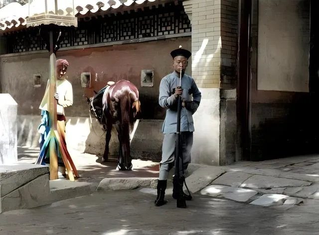 清末彩色老照片:官老爷坐着八抬大轿;装备步枪的衙门差役。