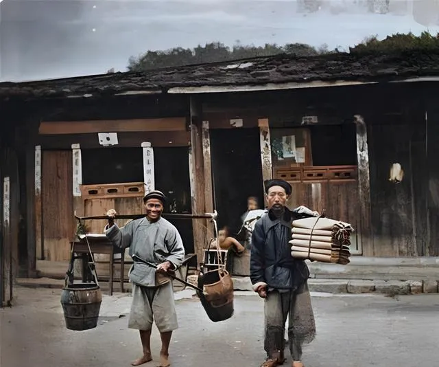 这俩人肩上扁担一挑,左边吊着木桶右边挂着铁锅,脚下却是光着的,图里的叫行商扁担,扁担中间把儿磨得发亮,手一握就贴合,老人说鞋底经不起这么折腾,干脆打赤脚,省钱也省心,回头到河边一泡就干净,现在谁还这么走生意,三轮车都嫌慢,手机上一点,货就自己找上门了。