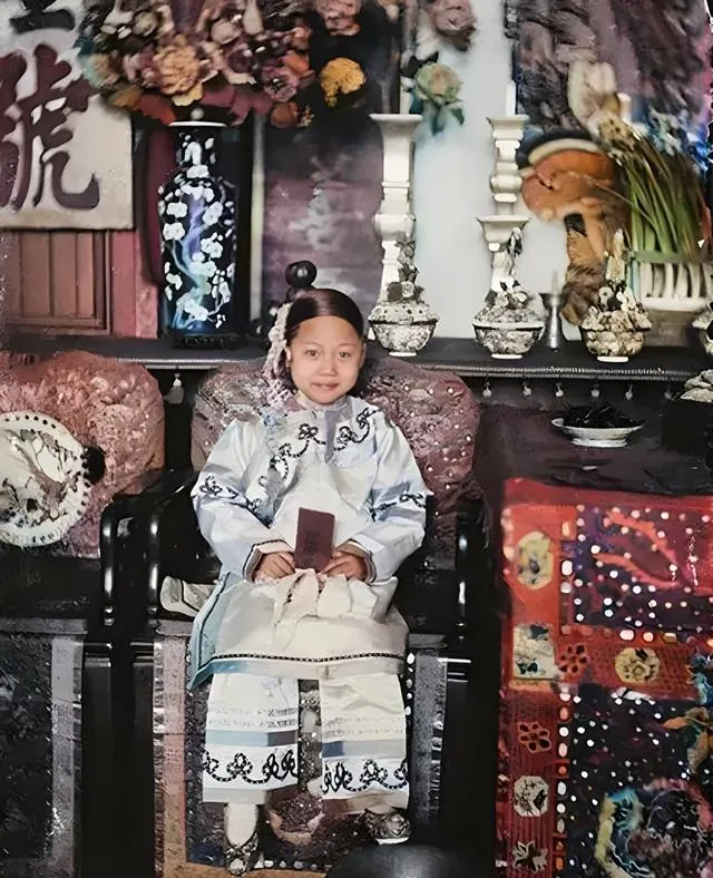 这身绣纹细密的叫旗袍,袖口和下摆一圈一圈滚边,女孩手里攥着个红包,脸蛋红扑扑,坐在雕花大椅上,四周摆满瓶罐挂画,像一小团喜气落在绣堆里,妈妈说,逢年过节穿新衣,是孩子们最大的盼头,现在衣柜一排换着穿,倒也没那股子期待了。