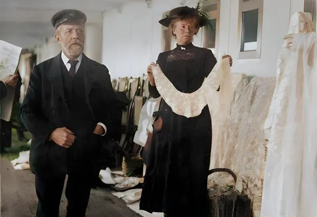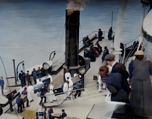 泰坦尼克号上色老照片揭秘:顾客在船上卖饰带,一二三等舱的模样。