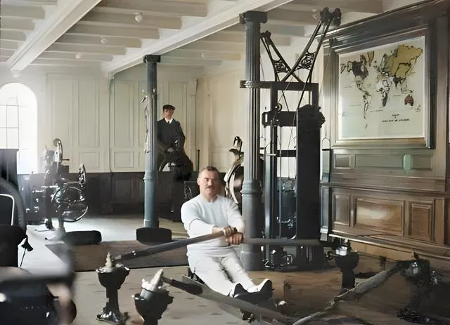 这个屋子叫小型健身馆,墙上一张世界地图压着金色的框,角落摆着奇怪的器械,像戏台的道具,其实名字一个比一个有趣,电动骆驼、电动骑马机、还有这台长条铁臂组成的划船机,前面这位白色针织套装的先生坐稳了,双手抓住把手,脚下卡在脚蹬里,一推一拉,金属连杆跟着咔嗒咔嗒跳,汗水把鬓角压塌一点点,他身后那位轻轻晃着骑马机,像在原地遛弯,爷爷说这东西讲究的是节奏,别蛮练,肩膀容易拉伤,以前没智能表计心率,全靠耳朵听呼吸,现在健身房花样更多,可这几台老器械的造型,搁今天开门也能当网红打卡。