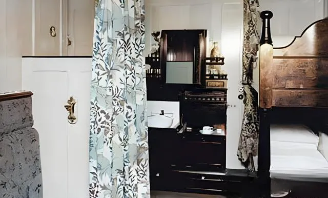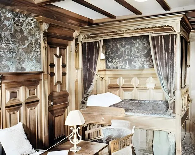 这个房间的主角就是四柱床,柱头雕着小花环,帷幔是灰紫色的绒面,拉开帘子,床沿有一圈浅浅的金漆线,旁边一盏小台灯头戴奶白色的灯罩,亮度恰到好处,木墙板有起有伏,像一块块饼干压出来的纹,一把轻巧的椅子凑在小桌旁,早上可以在这儿写信,墨水瓶轻碰一下就响,现在我们给朋友报平安发定位就行了,那时候要一笔一划写下亲爱的放心,我睡得很好,光是这句就比表情包沉甸甸。