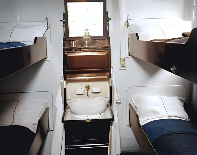 这个紧凑的空间就是三等舱卧铺了,左右各两层上下铺,木质床沿前端有一片透明防挡板,铺位不大,但白床单叠得板正,最聪明的是中间那套折叠盥洗池,像一个小柜门打开就是洗漱台,水龙头和镜子都在,收起来腾地方,船晃的时候不磕不碰,表是朴素的,可该有的照顾一样不少,奶奶说咱小时候坐长途,哪见过这么周到呀,带个搪瓷缸就算齐活了,现在我们老嫌空间小,可人家当年把每一寸都挤出体贴来了。