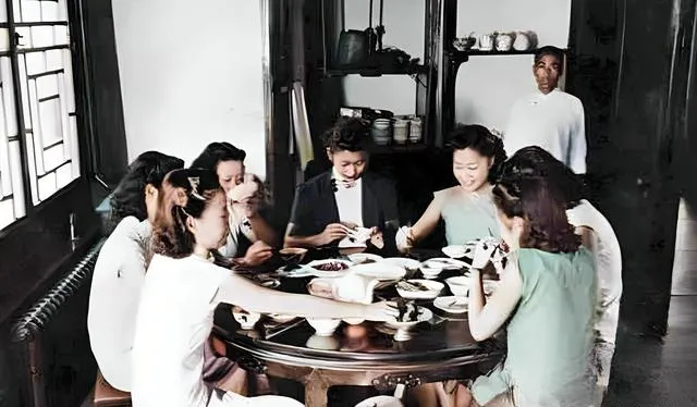 这个场景叫女学生的午餐,圆桌冒着热气,几碟小菜摆成一圈,七位姑娘穿旗袍也不拘谨,筷子一夹就开吃,后面还立着个小伙计守着招呼,奶奶指着桌边那把扶手椅说,这款椅脚是老匠人手打的榫,坐着不硌背,照片一亮,一下就有了家的气儿。