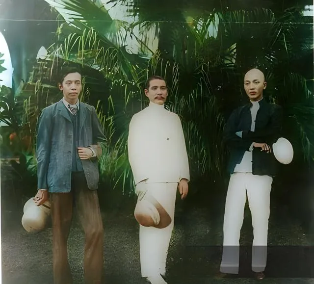 这张棕榈叶当背景的三人照,白色夏装配草帽,站姿各不相同,中间那位把帽子提在指尖,像刚刚从阳光里走出来,叶子背光发亮,边缘一圈浅绿,这是南洋特有的湿热味儿,外公说,南洋风吹过来,帽檐压低一点,不然头发全糊在额头上。