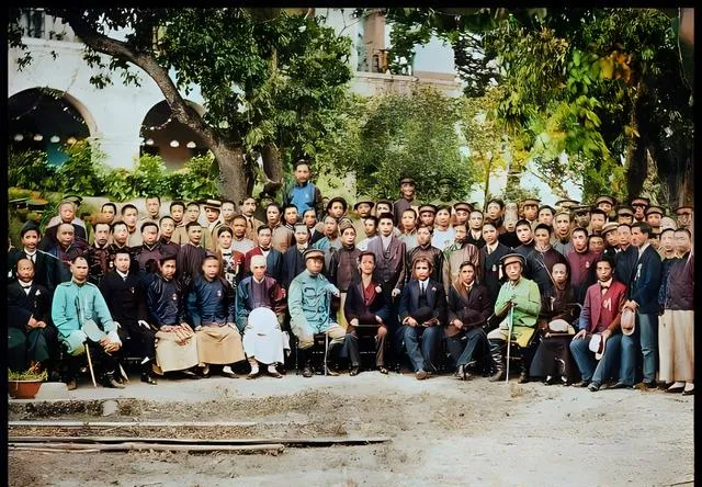 这张长排座椅的合影气势最大,树影罩着人群,前排中间那位坐着的是核心人物,左右都是文武幕僚,衣色从灰蓝到深青一字排开,像一条稳稳的河,照片上头还印着字,老派相馆的口味,妈妈看了笑,说现在开会P个合照两分钟搞定,以前一张合影,先排位再端坐,咳嗽都要忍着,拍出来才显得郑重。