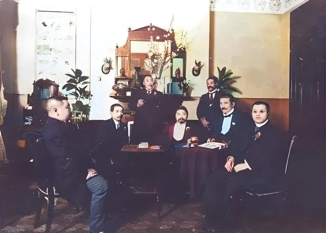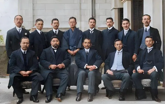 最后这一张穿西装的人围坐台阶,领结的、立领的、和服外袍的都有,脸上很少笑,衣料笔挺,鞋尖擦得发亮,台阶横缝像格尺一样把人分层,照片没有摆花架子,却把那股生意场的硬气拍得清楚,以前谈合作,靠面见和握手,现在视频一开,连皮鞋都用不着擦了。