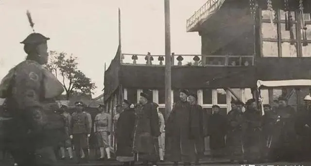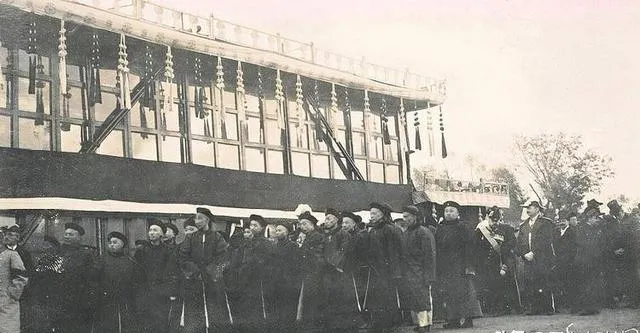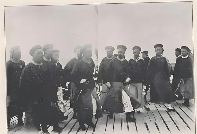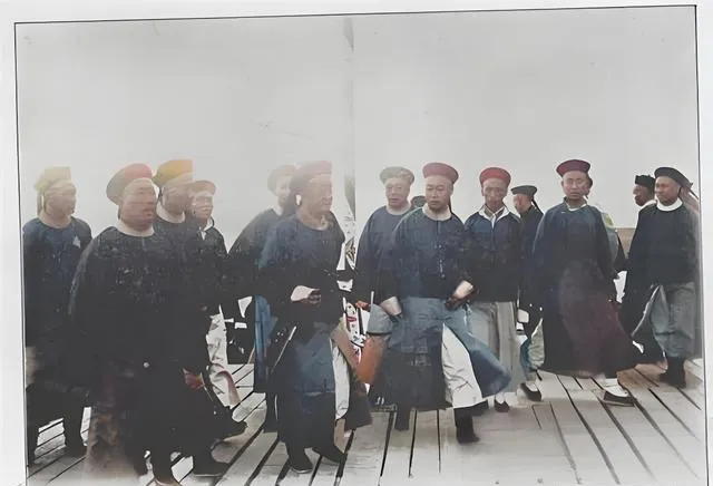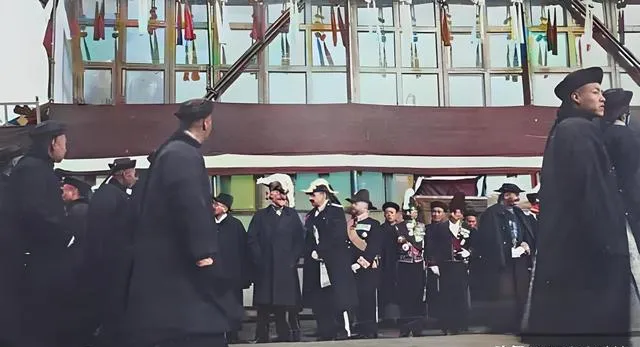 图中这一队人叫清末官员迎接队,圆顶瓜皮帽一色压得稳,袖口宽肥,马褂下摆在木栈道上被风掀起一角,黑靴尖从衣襟底下探出来,腰间挂着的荷包和钥匙坠子叮当作响,走起路来带着阵仗,站在中间的那位脚尖朝外,像是刚落地要转身说话,旁边人半笑半应,神色里都透出点打量与客气,这种排场在照片上看着不吵不闹,可你细想,锣鼓队、旗伞手、关防验票,一个环儿都不能少,以前迎船迎客讲究脸面,现在呢,接机用车牌举个牌,三分钟搞定。