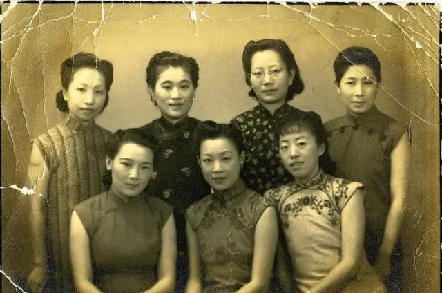 这个合照里的装束叫时兴旗袍,七位女士分成两排坐站有致,绸缎和提花看的不抢眼却有门道,领口高,袖子多是无袖或小短袖,耳垂上一点点金光,像是豆大的珍珠,发边抹了定型油,前额轻轻一折,镜头前不做作,只把下巴收一收就成了,奶奶看见这张图笑我,说那会儿逛南京路,姐妹们最爱挽着去照相馆,站位也是讲规矩的,谁个子高谁靠后,谁穿深色谁居中,可如今拍照不讲究这些,手机举起连拍十张,挑一张加个滤镜就发了。
