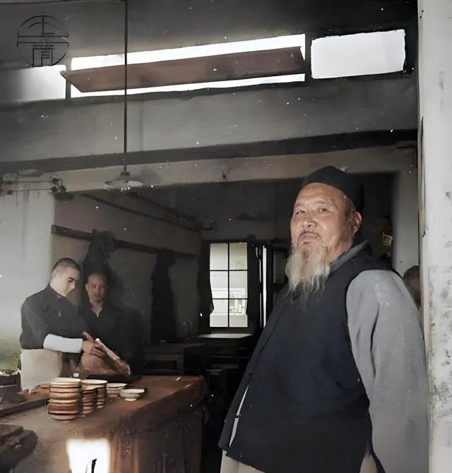 图里这位胡子花白的叫掌柜,靠案台斜斜一靠,袖口挽到手肘,身后的徒弟正把肉片一摞一摞码齐,木案台被油光摩得亮亮的,碗盏摞成小山,屋梁上挂着风干的抹布,窗纸透进一点冷光,像午后的雾,爷爷说北平的老字号就这股子劲,讲究火候与规矩,刀要柳叶,炙子要老铜,柴要干松木,动静不大,味道全在气里,小时候我跟着他去吃,等肉时他总敲着碗边说,别心急,慢炙才出香,现在外卖点得飞快,二十分钟没到就催,味道倒是齐活了,讲究却少了半口气。