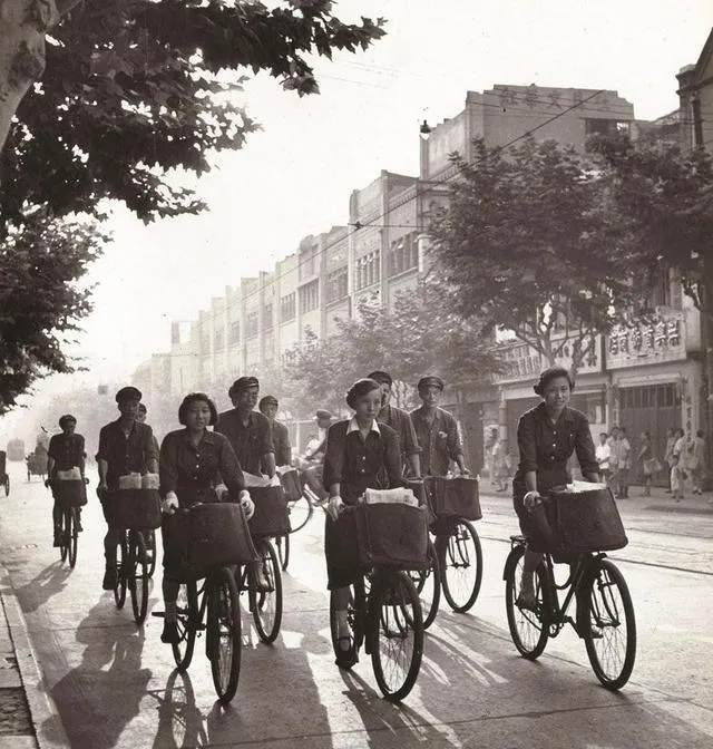 图中这一排自行车叫绿邮包配28大杠,人手一辆黑亮的大梁车,车把上挂着布邮包,口袋里塞满信件和报纸,队形拉得齐齐整整,一脚一脚蹬在老上海的马路石板上,链条“嗒嗒”叫,晨雾里有股子新鲜劲儿,妈妈看见照片笑说,那会儿等信像过年,邮差远远一出现,院门口就有人招呼,递给他一杯凉白开。