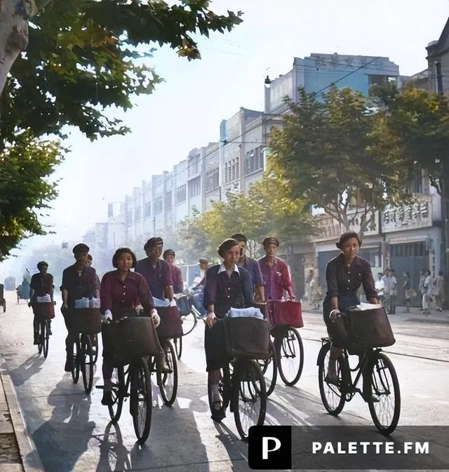 这个画面还是那队邮递员,只不过被上了彩,深蓝制服配卡其邮包,树影打在衣袖上,楼房立面是浅灰砖缝,天光一照更显精神,这会儿才知道为什么叫时代的脉搏,颜色一复原,心里咯噔一下,仿佛车铃在耳边又响起来了。