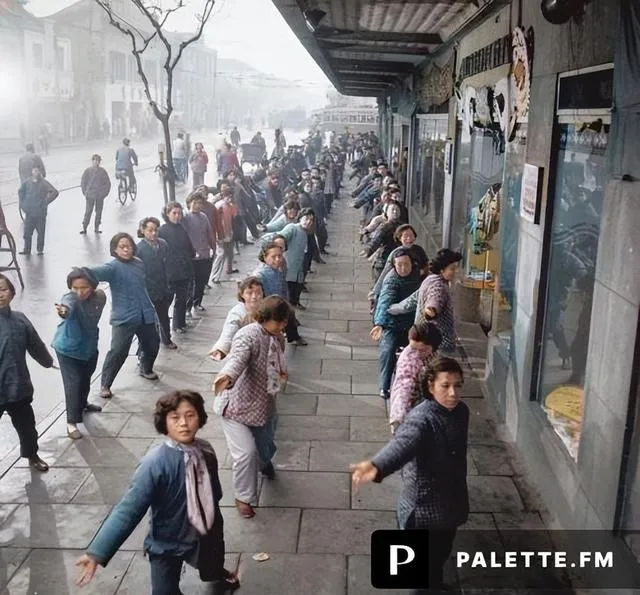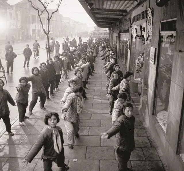 图中伸臂转肩的动作叫第一节伸展运动,一溜人从门口排到街角,棉袄棉裤跟着口令一前一后,谁也不抢拍子,小时候我在外婆店门口看过类似阵仗,外婆说,先把筋骨舒坦开,干活才带劲,现在上班族做拉伸都在办公室里了,街头这么豪横地做体操,真是只属于那时候。