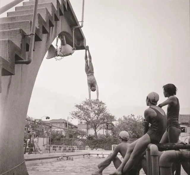 彩色版里,泳池是亮到发光的蓝,跳水裤子是青绿,阴影压在台阶的水泥面上,边上的同伴互相碰一下肩膀,像在说你看着,我一会儿更稳,嗯,这画面不用多感叹,青春自己会发光。