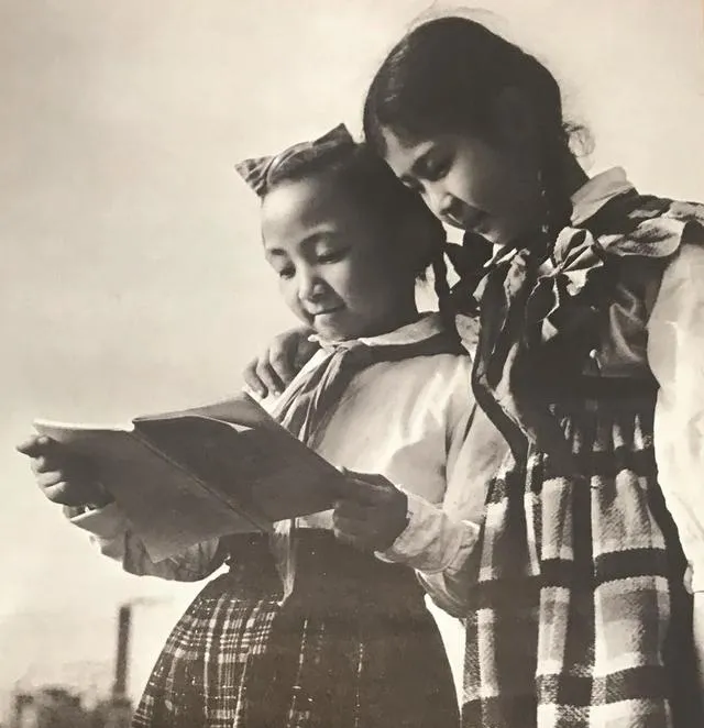 这个发式叫蝴蝶结辫子,两人一左一右,肩挨着肩看课本,纸边翻起了一点毛刺,太阳从侧面照下来,把裙子格纹里的暗线印得很清楚,我小时候也这么挤着和堂妹看连环画,奶奶在旁边嘀咕,离眼睛远点,别凑那么近。