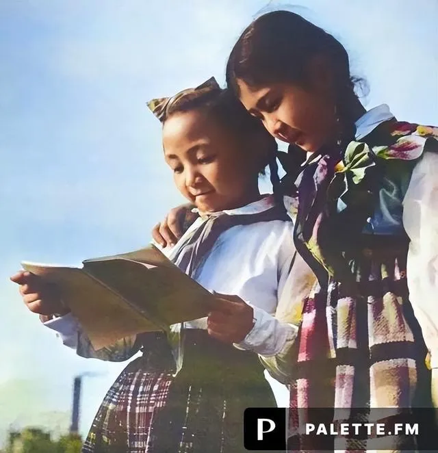 彩色之后,蝴蝶结是嫩绿,格子裙红里带紫,课本封皮泛黄,背景的烟囱淡淡一根,这种明亮的朴素,现在小朋友拍照都要滤镜才能调出来。