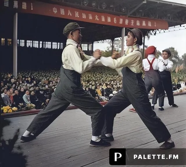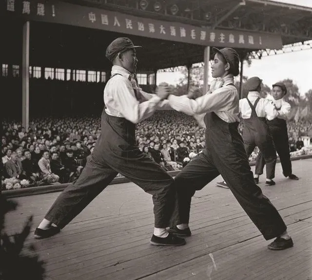 图中两人握腕的动作叫对练定步推手,肩背一撑,脚下叉开,布鞋擦过木台板,台下人头攒动,掌声一浪一浪地压过来,爷爷年轻时当过场务,他说那时候最怕台上掉道具钉子,演员一脚下去就得破相,可人家照样稳稳当当地演完。