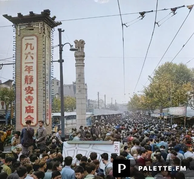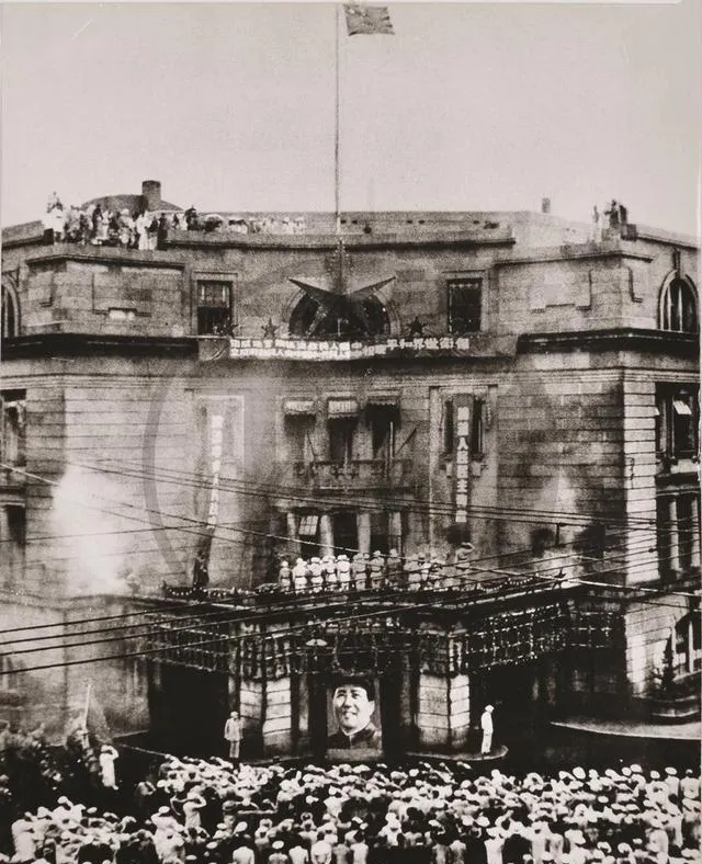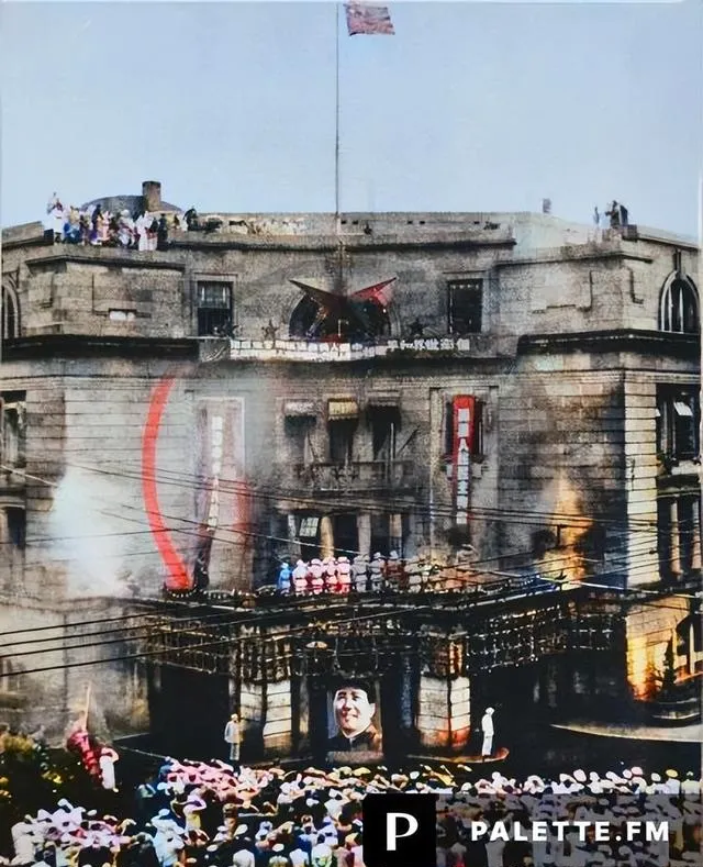 彩色版里,楼体石灰黄,旗红鲜得直扎眼,楼下白衣、粉衫混在一起,像一片翻滚的浪,镜头站得高,俯下去把人海压得更密,历史靠近你时,真的会发烫。