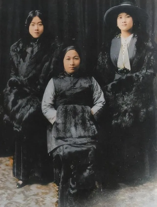 这幅黑底的叫冬日正装,三人衣领袖口都衬着毛边,坐中间的手里抱一块厚皮,左边头发披肩,右边压了宽檐帽,色调沉得像夜里落雪前,那会儿拍照讲究仪式,站位讲究平衡,脸上不必笑,气派自然就出来了。
