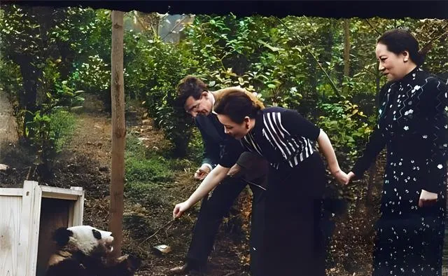 这张活泼的叫看熊猫,围着竹林边的小圈,竹竿伸过去逗着小团子,旁边人弯着腰笑成一条弧线,另一位牵着手,神情里是忍不住的喜欢,衣服的黑白条纹在绿影里头跳,谁说那会儿日子就只有端着啊,逗一逗笑一笑,也是人间最普通的高兴。