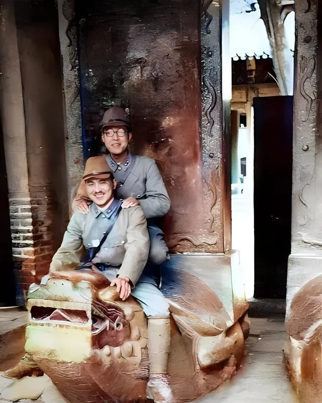 这对笑眯眯骑坐在石雕上的侵略者,脚下踩的叫“霸下”,是碑座神兽,背上原该驮着碑,留给后人读史,他们把手搭在彼此肩膀上,拿它当坐骑取乐,口角扬着轻佻,这一幕真是刺眼。外婆看这种照片会压低嗓门,说“地方是人家的,理不是”,以前讲规矩,殿前不高声,石物不乱触,现在看回去,只觉心口憋闷,尊重两个字,太值钱了。