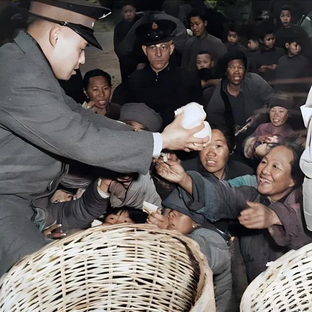 民国上色老照片:美国人监督国民党发放食品;被俘的解放军女兵。