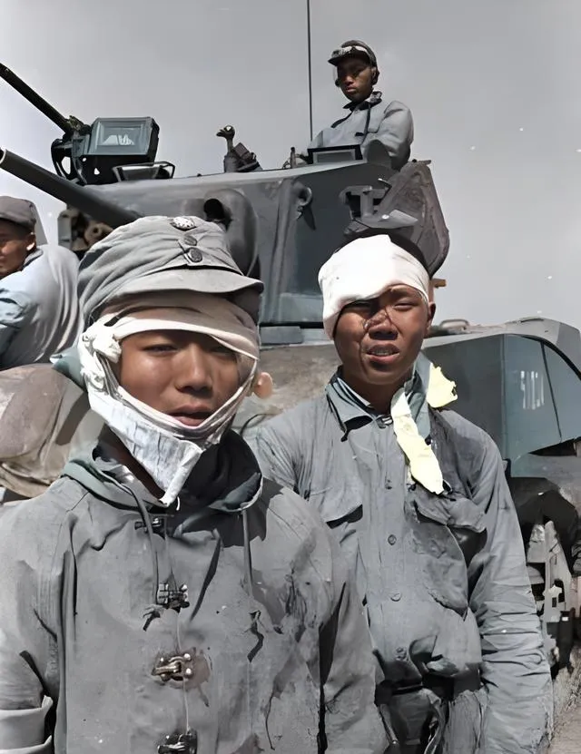 这两位身上的白绷带就是三角巾和纱布缠带,裹得急,结头打在耳后,风一吹,尾巴乱晃,身后铁家伙的舷边是冷的,灰漆上蹭了砂眼,光照一亮,金属把脸色衬得更白了。他们眯着眼,像是被太阳扎了下,嘴角却带着一点忍笑的劲,年轻脸上那点倔强是藏不住的,爸爸看了一眼说,这叫从火里出来的人,没工夫摆姿势,站住就行。