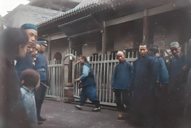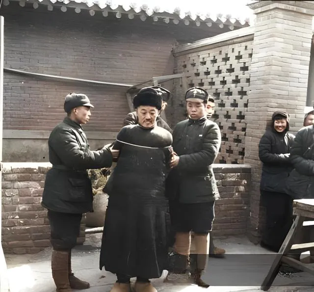 这张里粗麻绳打的是个死扣,勒在黑呢大褂外头,绳纹像鱼骨,两边年轻兵丁一左一右拽着,院墙上是空心砖的花洞,阳光从洞里打进来,在地上排成一列列方块影子。爷爷说,这种粗绳子一到冬天就硬,手上没劲的人打不紧,打松了就会滑扣,所以看照片里二位把手背夹得紧紧的,这活儿要靠劲儿也要靠准头,差一点就不成事。