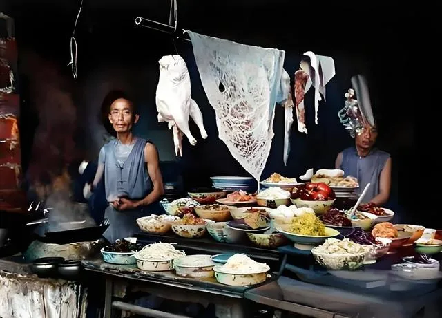 图中这一大摊子锅碗瓢盆,叫老灶台加长案板,黑铁锅边冒着白汽,案上搪瓷海碗一溜排开,青红黄白的菜码看着就有滋味,后头吊着一面薄到能透光的猪网油,师傅袖子挽到胳膊肘,铁勺一抡就是一声清脆的响,妈妈看见照片笑说这才是正经的热闹厨房,先下油再爆小料,勺底一贴锅,香味就跟着人流窜出门槛了,现在餐馆后厨全是不锈钢,干净利落是干净利落,可少了点子烟火的松弛劲儿。