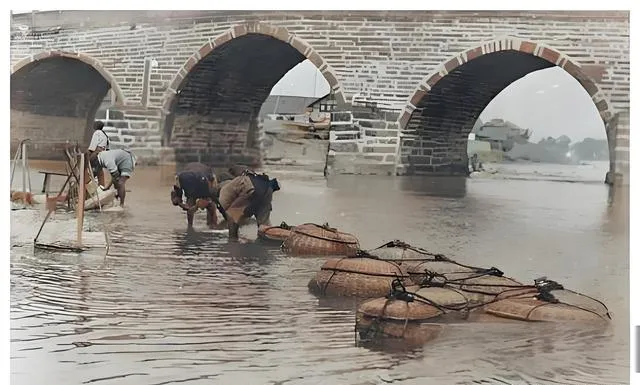 这个绑成一串的圆肚家伙叫浸麻筐,麻杆压在水里泡透了再起出,桥洞回声空空,几个人弯腰一抬,水花一甩就拍在腿上,师傅嘴里喊着号子,动作要齐,晚一步就吃力,爸爸说河里有股青涩味儿,那是纤维醒来的味道,现在工厂一条线下来,均匀是均匀,手上的老茧却没了落脚处。